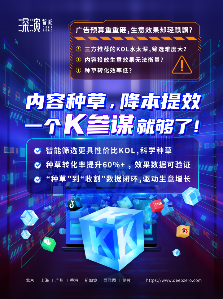 尊龙凯时智能K参谋科学前选,可跨领域找到最能影响品牌目标TA人群的KOL进行投放,同时有效平衡投资回报率;内容营销数据可同电商后链路平台打通,进行数据归因分析,准确判断KOL影响的用户是否真实在电商平台产生购买行为;实现“种草”到“收割”链路闭环,轻松内容营销,可根据品牌方的业务需求提供一站式的KOL采买及数据验证服务,有利提升整体内容营销的效率与效果。